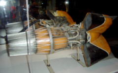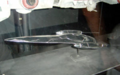 The entry to the second floor of the exhibition illustrates the engineering behind pioneering transport modalities such as Paul Moller’s VTOL (vertical takeoff and landing) M400 Skycars, and Scaled Composite’s SpaceShip One, to conceptual technology such as the British Interplanetary Society’s thermonuclear-propelled Daedalus proposition, Bussard’s Ramjet of the 1960s (a fusion-powered engine fueled by hydrogen collected by it’s thousands-of-kilometers-wide magnetic scoop), and matter/antimatter propulsion systems. These realistic or realised technologies are compared against the transportation tools and designs of the Star Wars universe.